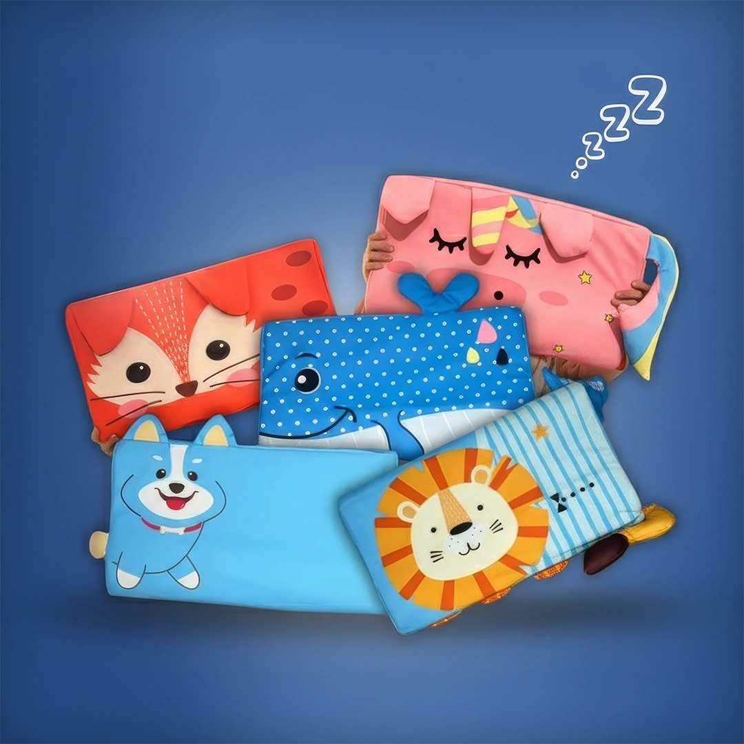 Lunillow® n’est pas un “gadget” : c’est une combinaison unique de soutien cervical ergonomique et de zones tactiles apaisantes qui aide l’enfant à se calmer naturellement.